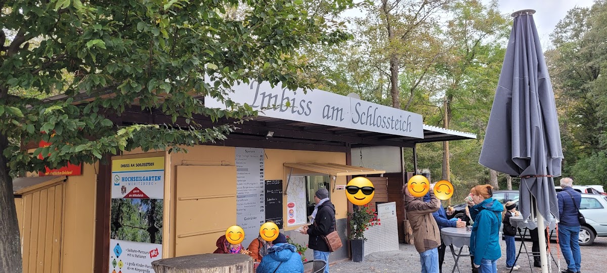 Komm doch mal vorbei, kann es nur sehr empfehlen. 1.) Personal nett, freundliche und schnelle Bedienung 2.)Bratwurst wie sie sein muß, sehr lecker, dazu ein schmackhaftes, kuspriges und warmes Brötchen 3.)Kaffee schmeckt auch noch gut, Milch und Zucker nach Bedarf reichlich zur Verfügung! Was willst Du mehr von einem Imbiss im Wald mit herrlichem Blick zum Schloss? 5 Sterne ohne Zögern!